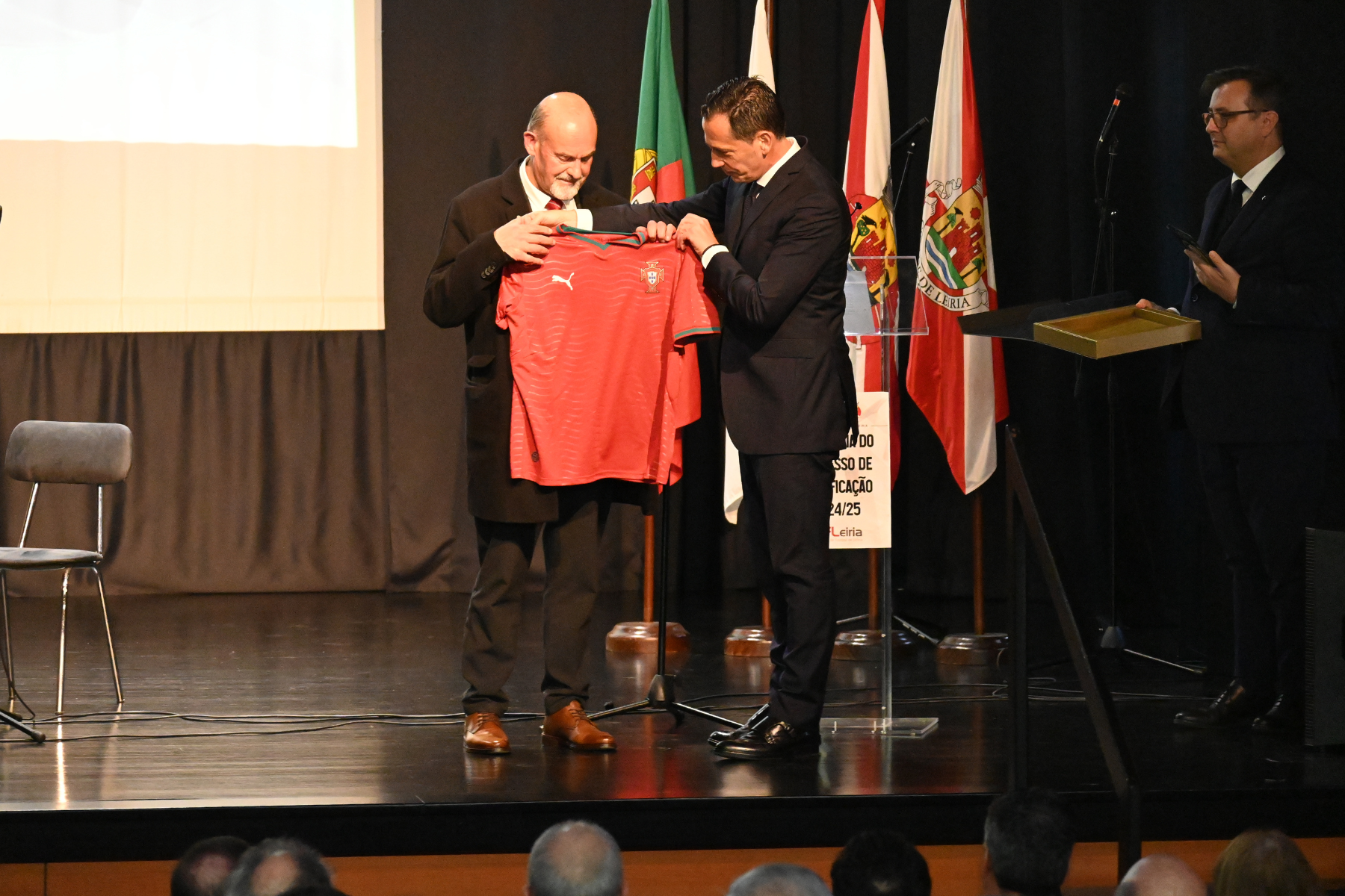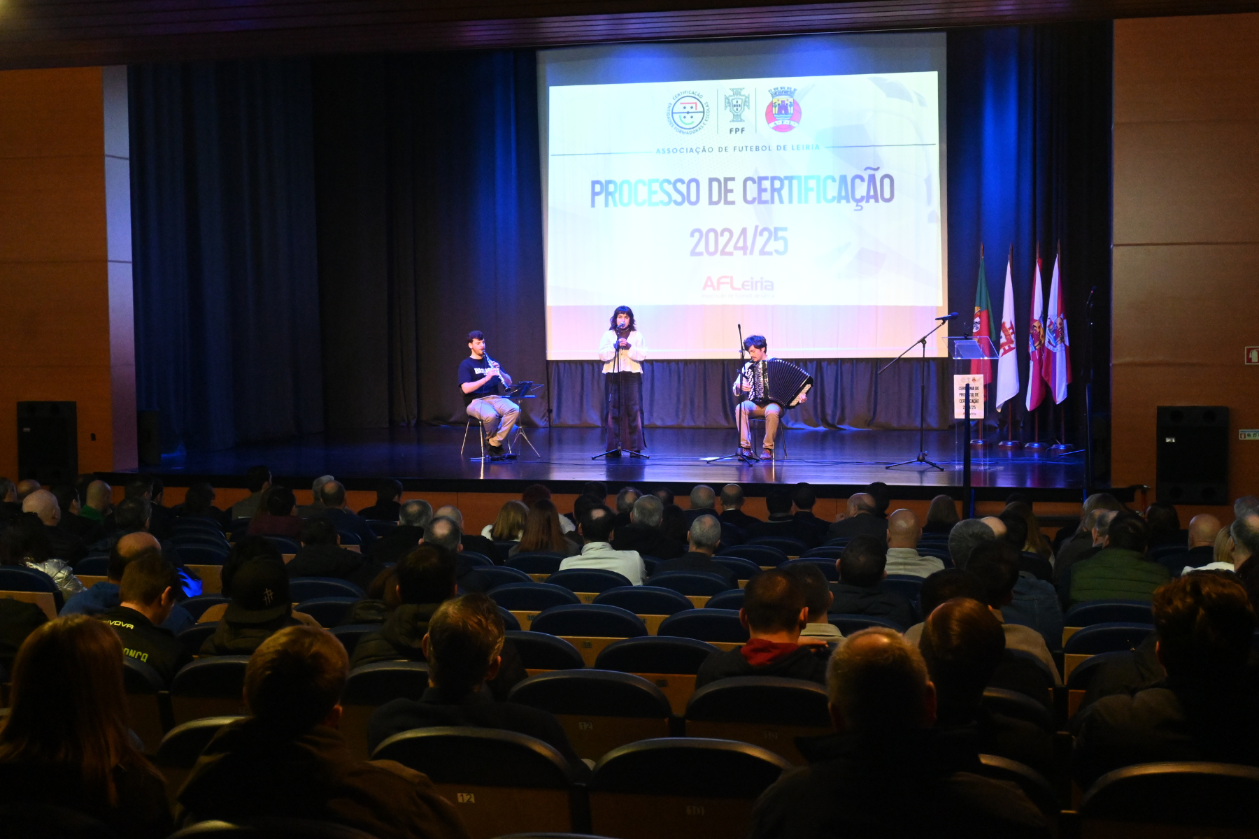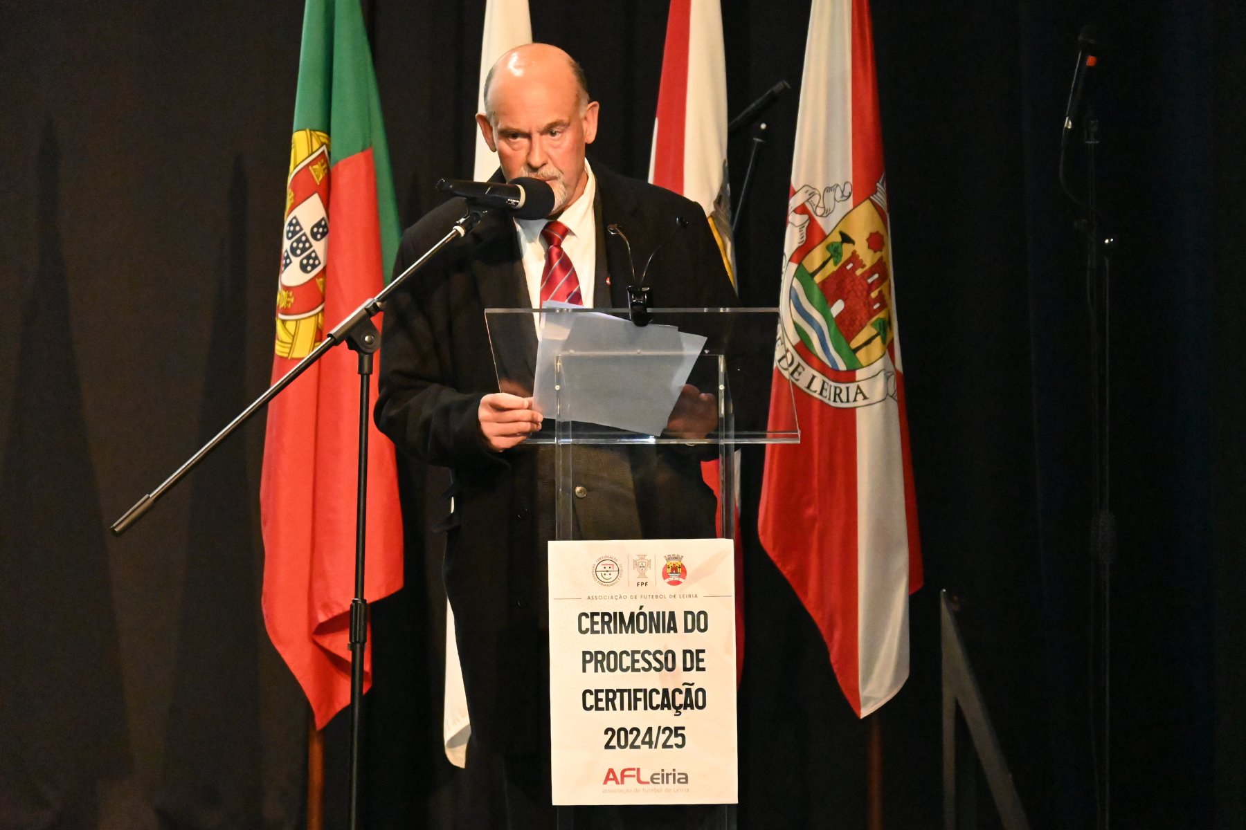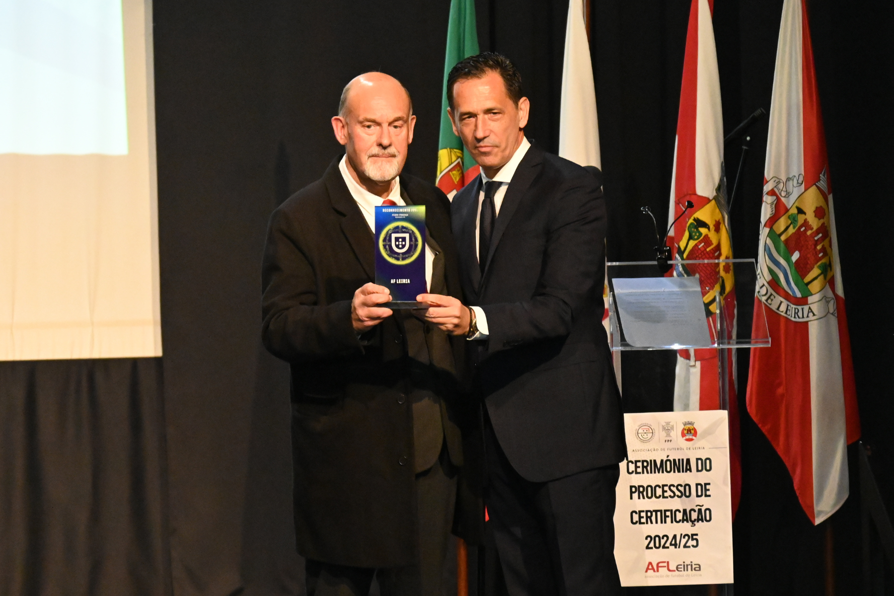 O Auditório da Filarmónica de Chãs recebeu este sábado a cerimónia de entrega de diplomas de certificação às entidades formadoras do distrito de Leiria. O evento contou com a participação e discursos de Pedro Proença, presidente da FPF, Carlos Mota Carvalho, líder da AF Leiria, e do Vereador da Câmara Municipal de Leiria, Carlos Palheira, numa cerimónia que premiou todos os Clubes certificados na época 2024/2025.